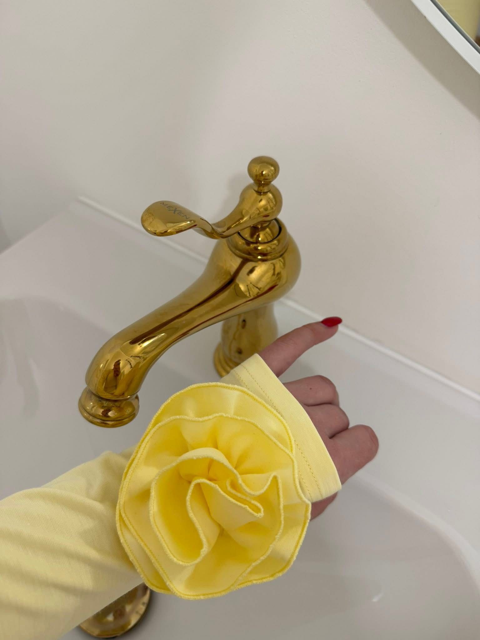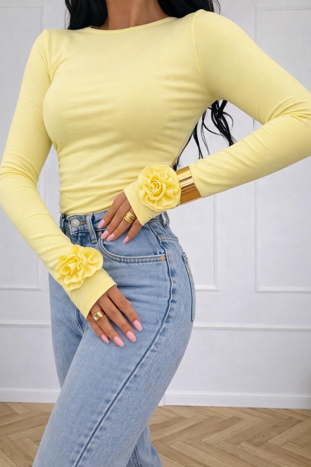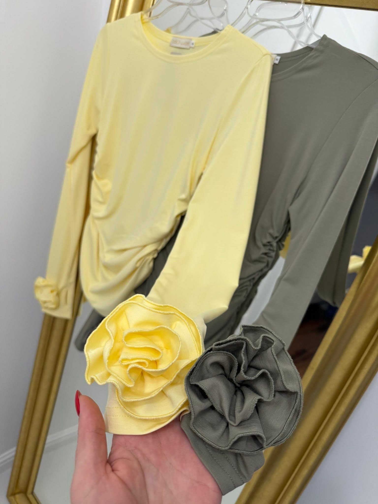 Bluzka idealnie sprawdzi się jako baza pod marynarkę — delikatnie wystający rękaw z Różą i otworem na palec dodaje jej wyjątkowego charakteru.