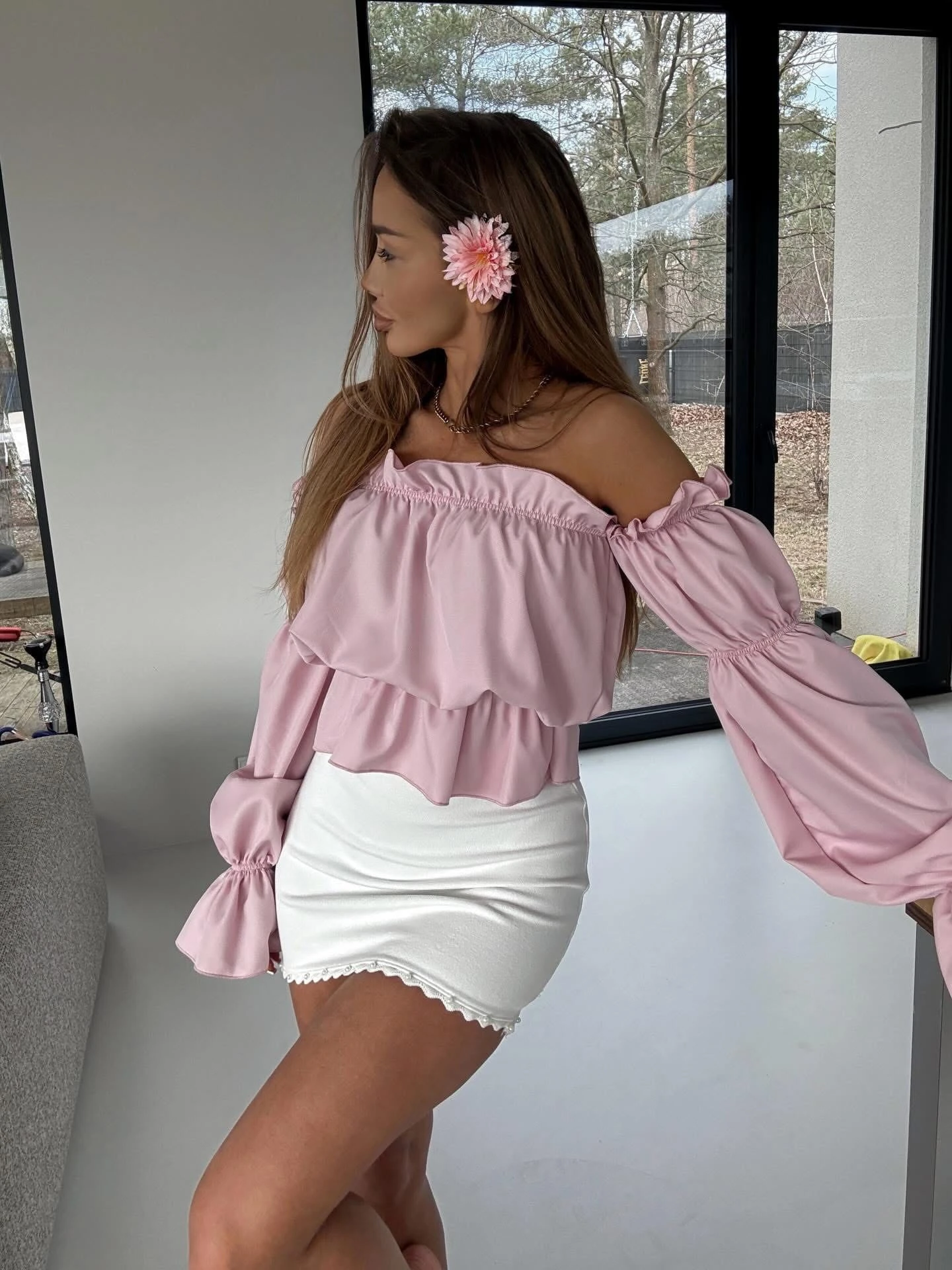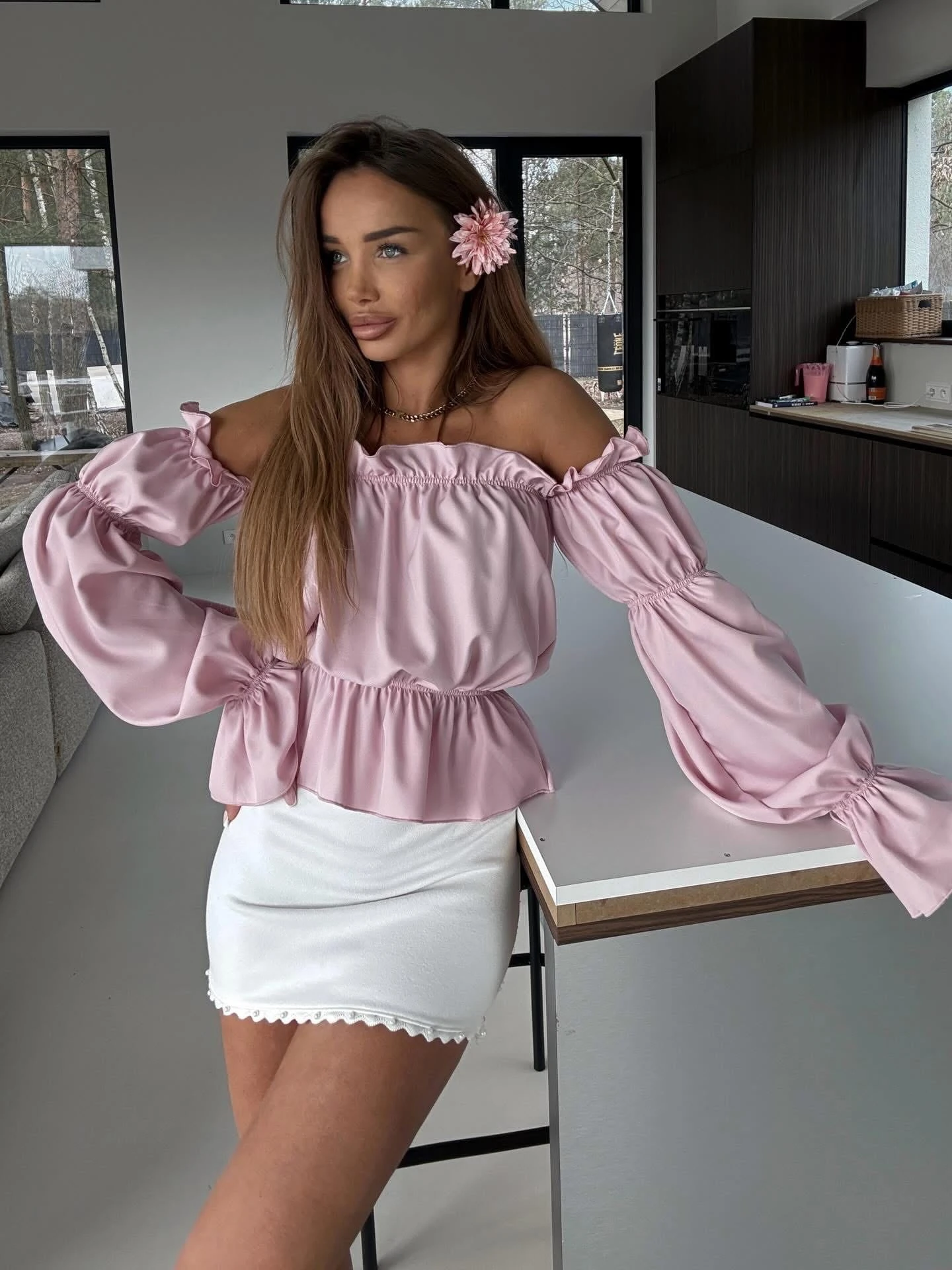 Bluzka o kobiecym, romantycznym kroju z efektowną falbaną i odkrytymi ramionami. Model z elastyczną gumką przy dekolcie oraz rękawach, dzięki czemu idealnie dopasowuje się do sylwetki i zapewnia komfort noszenia. Bufiaste rękawy dodają lekkości i stylowego charakteru, a luźniejszy fason pięknie układa się na ciele.