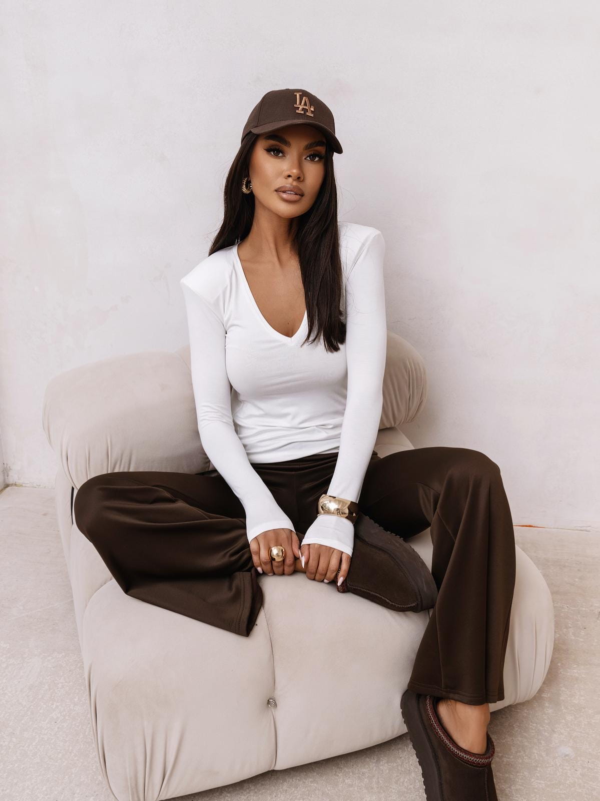 Minimalistyczna i pełna charakteru bluzka, zaprojektowana tak, by podkreślać sylwetkę i dodawać stylizacji nowoczesnej elegancji. Subtelne poduszki na ramionach tworzą delikatny „power look”, a klasyczny dekolt V wysmukla linię szyi.