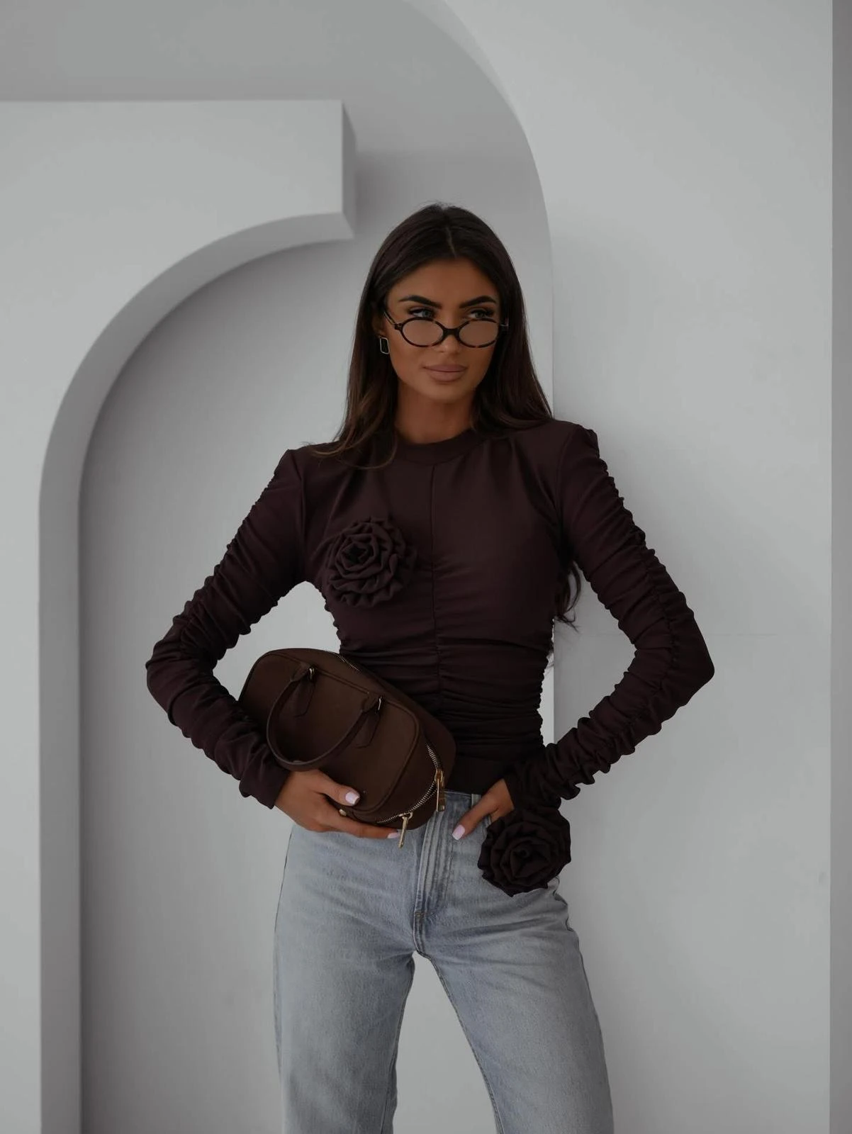 Bluzka z marszczeniem i odpinanymi różami czekolada Miluna