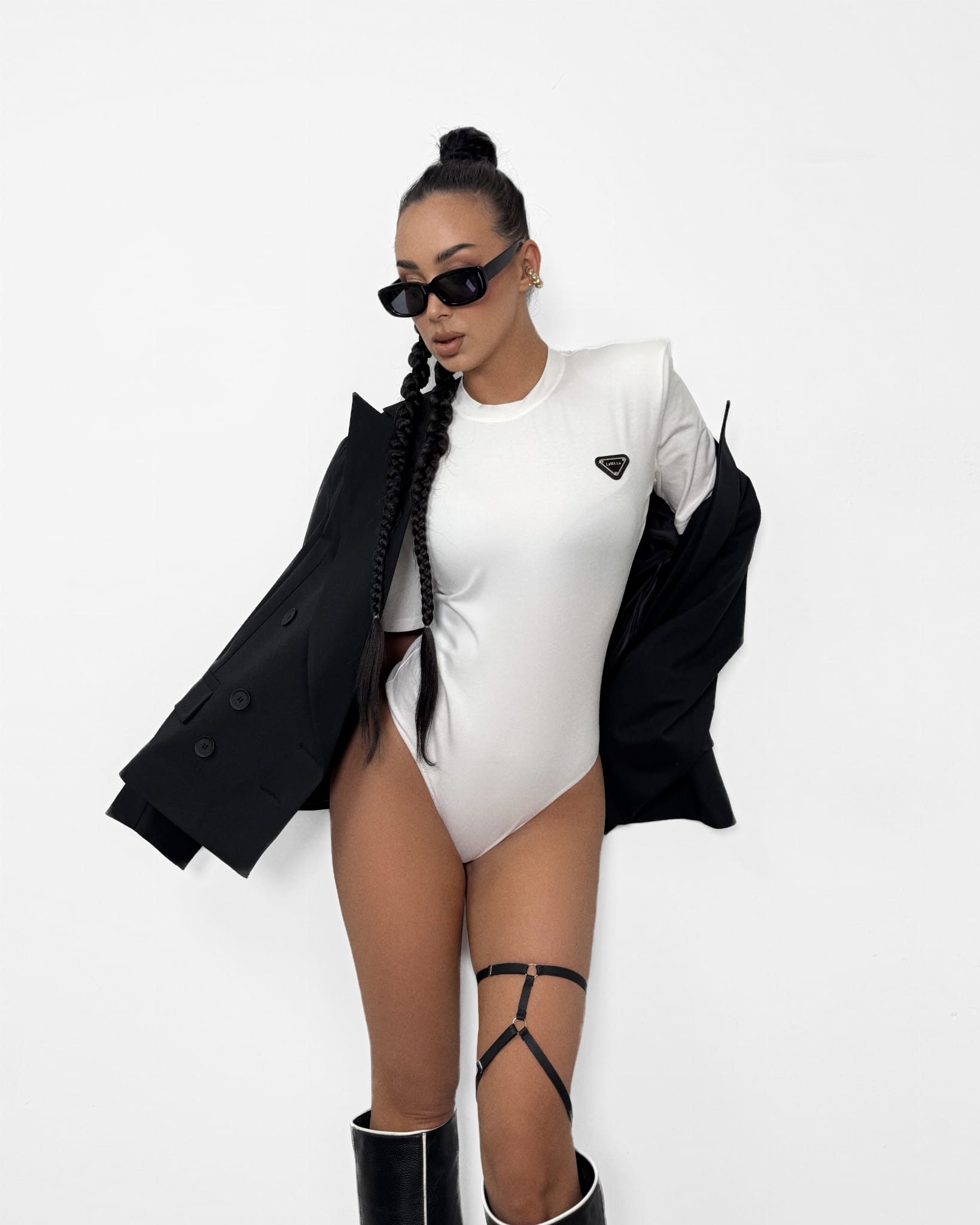 Stylowe body marki LA MILLA o klasycznym, dopasowanym kroju, który pięknie podkreśla sylwetkę. Model z okrągłym dekoltem pod szyję, wykonany z elastycznego materiału gwarantującego komfort noszenia i idealne dopasowanie. Poduszki na ramionach dodają nowoczesnego charakteru i wyrazistej formy. Body z krótkimi rękawami, majtkami typu figi zapinanymi na praktyczne zatrzaski oraz subtelną, logowaną naszywką. Doskonały wybór zarówno do codziennych stylizacji, jak i bardziej eleganckich zestawów.