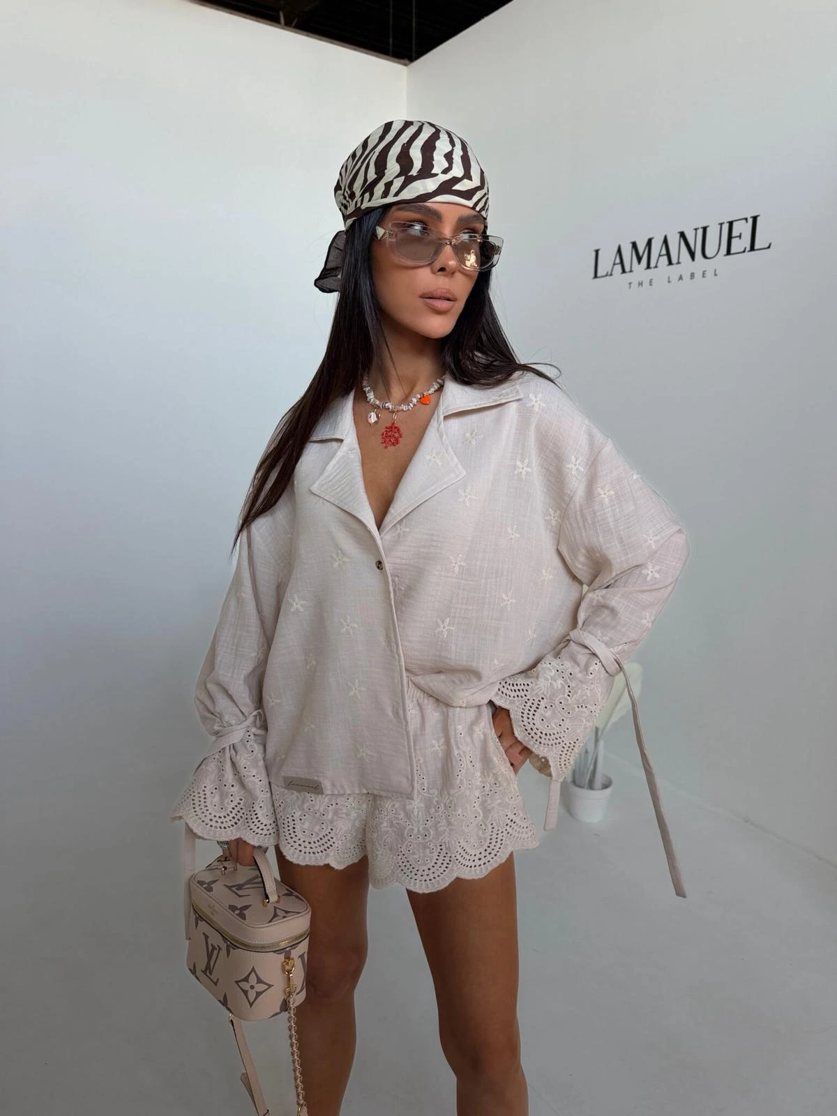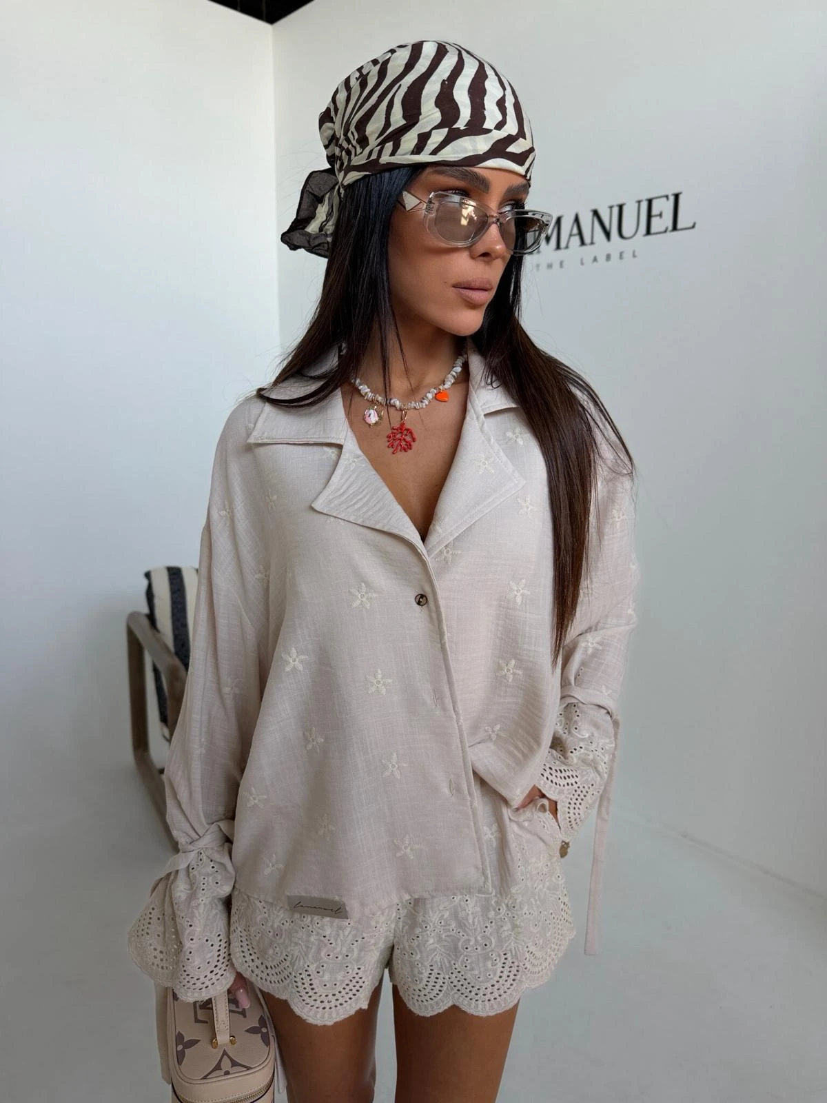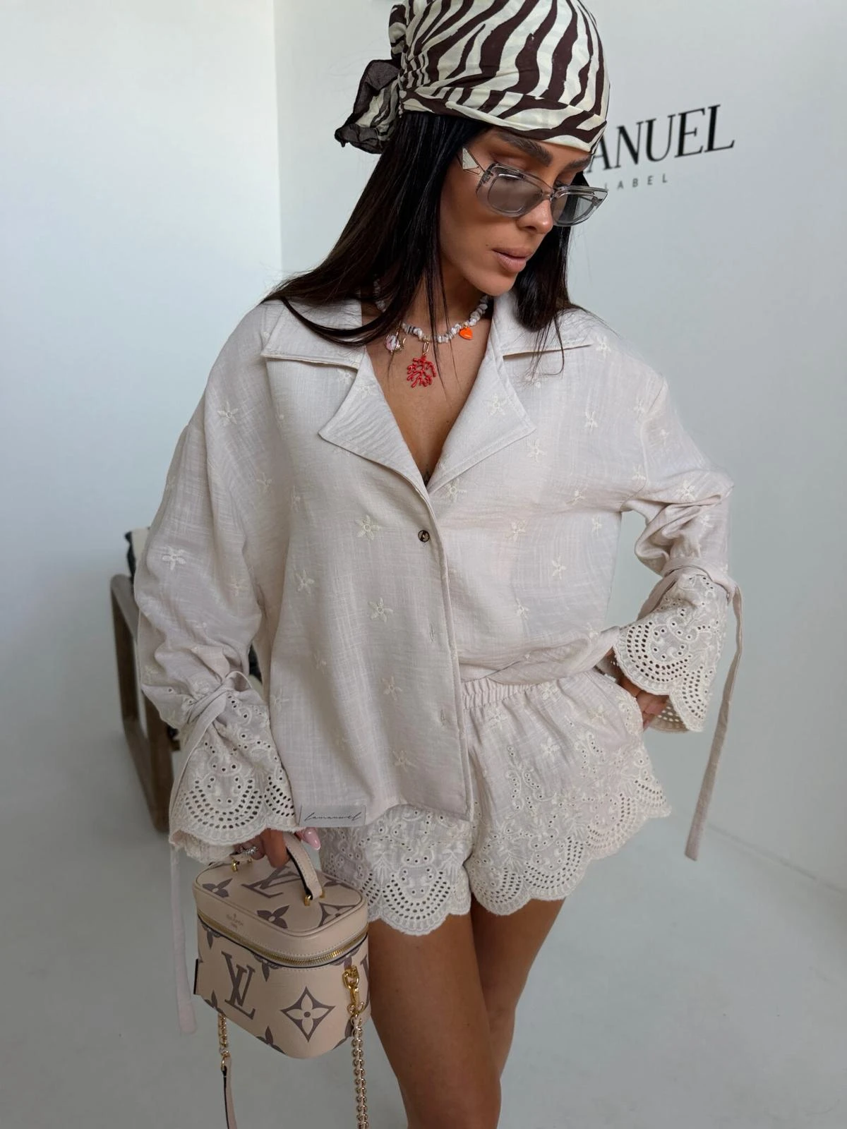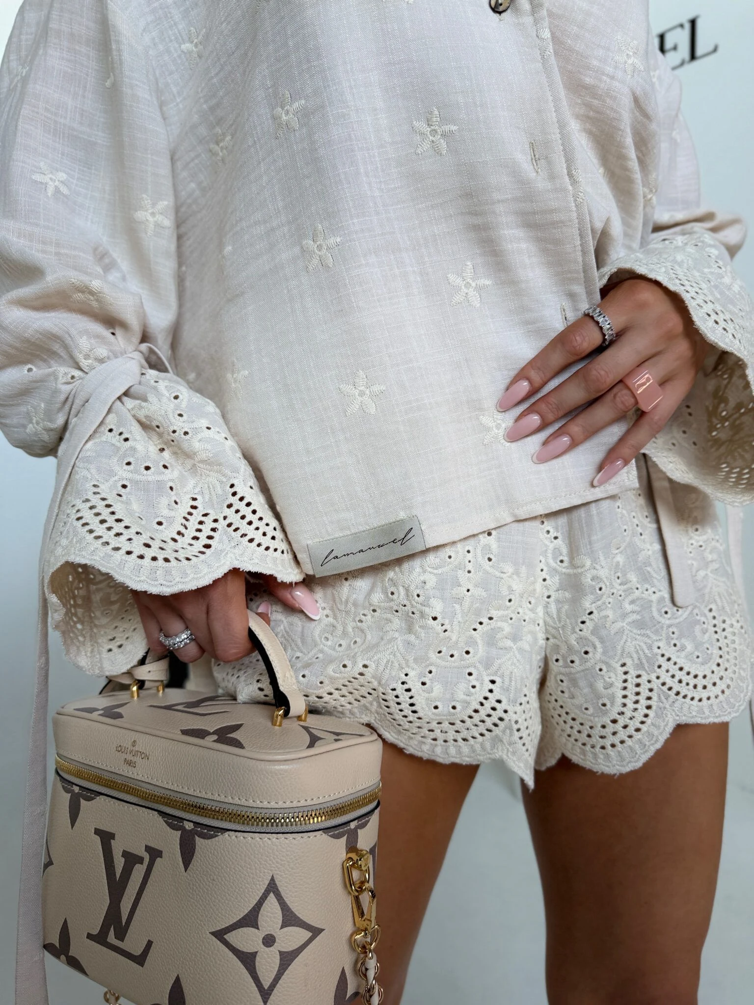 Lekkość, która przyciąga detalem. Zwiewna koszula o luźnym kroju subtelnie układa się na sylwetce, tworząc naturalny, niewymuszony efekt, a haftowane wykończenia dodają całości romantycznego charakteru. Szerokie rękawy zakończone ozdobną koronką podkreślają wyjątkowość formy i nadają stylizacji wyrazistości. Szorty z ażurowym wykończeniem eksponują nogi i wprowadzają letni, świeży vibe, jednocześnie zachowując komfort dzięki elastycznej talii. Całość tworzy spójny, kobiecy look idealny na ciepłe dni – lekki, ale dopracowany w każdym detalu.