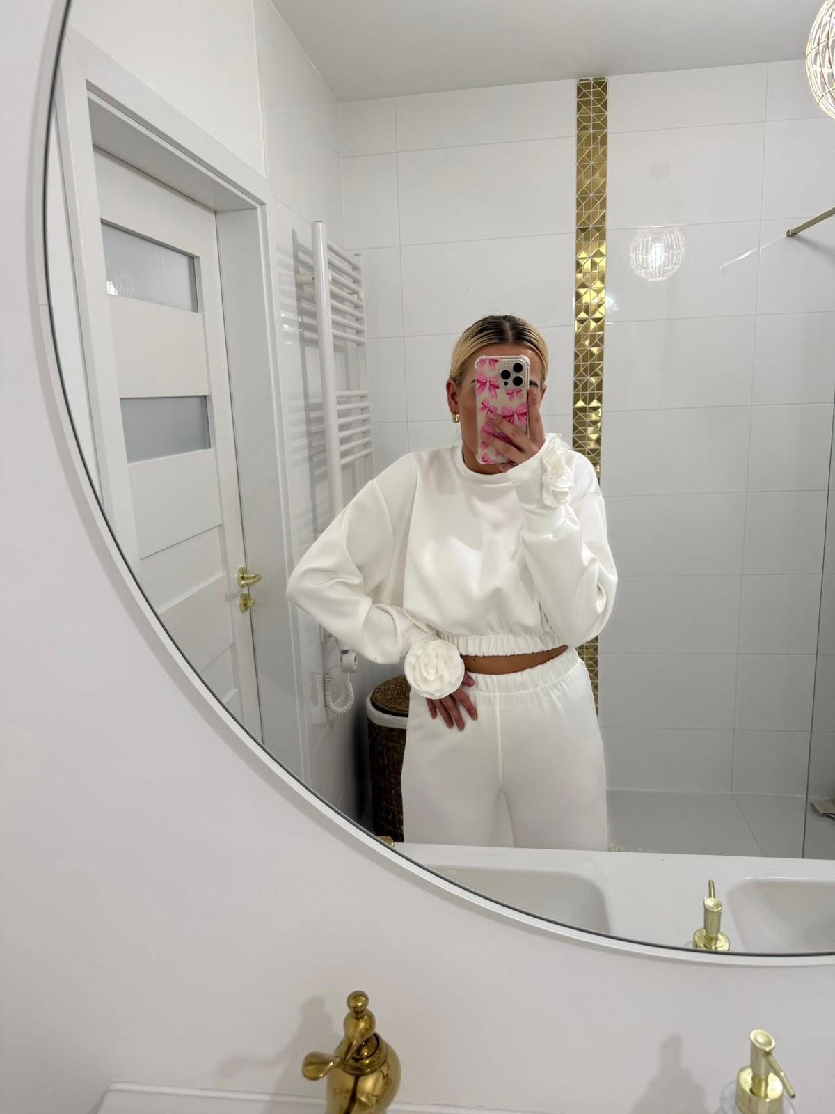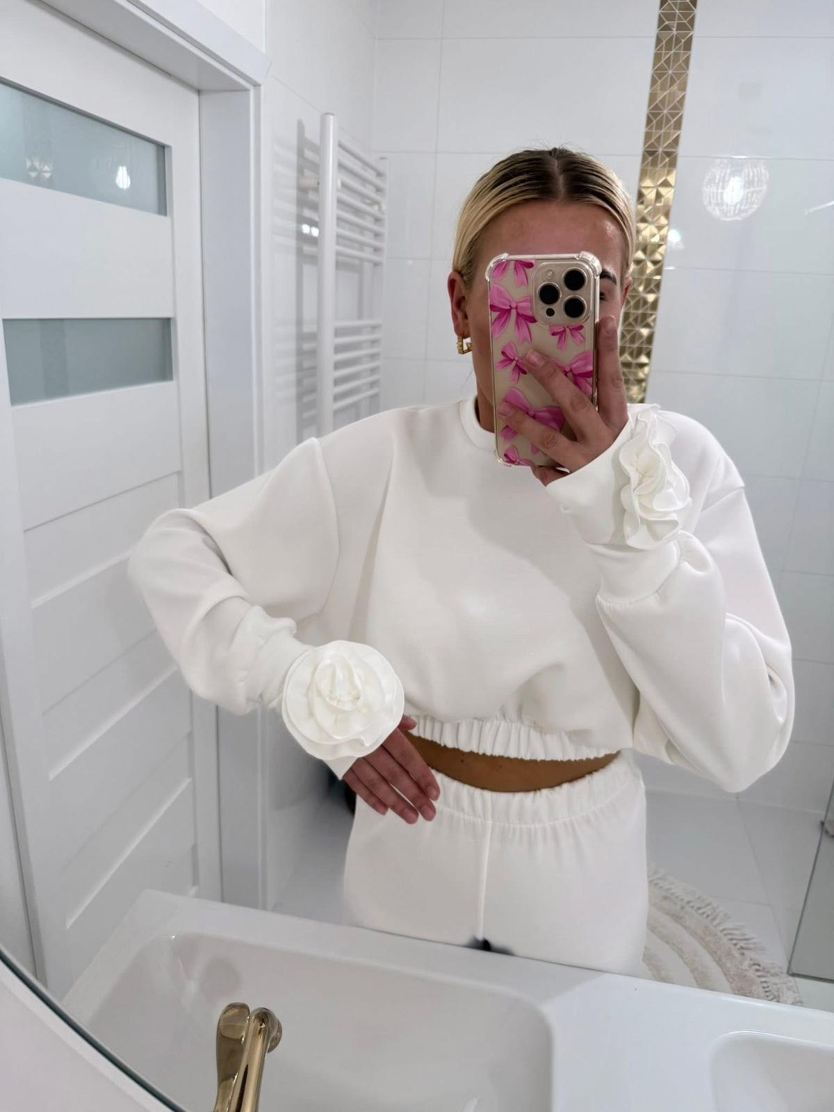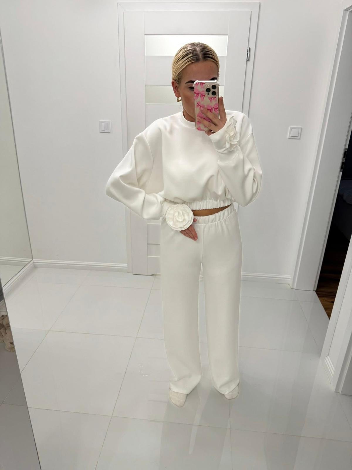 Stylowy i niezwykle kobiecy komplet dresowy w odcieniu delikatnej śmietanki to połączenie wygody i subtelnej elegancji. Minimalistyczna forma została przełamana efektowną aplikacją róży przy mankiecie oraz w pasie, która nadaje całości wyjątkowego charakteru.
