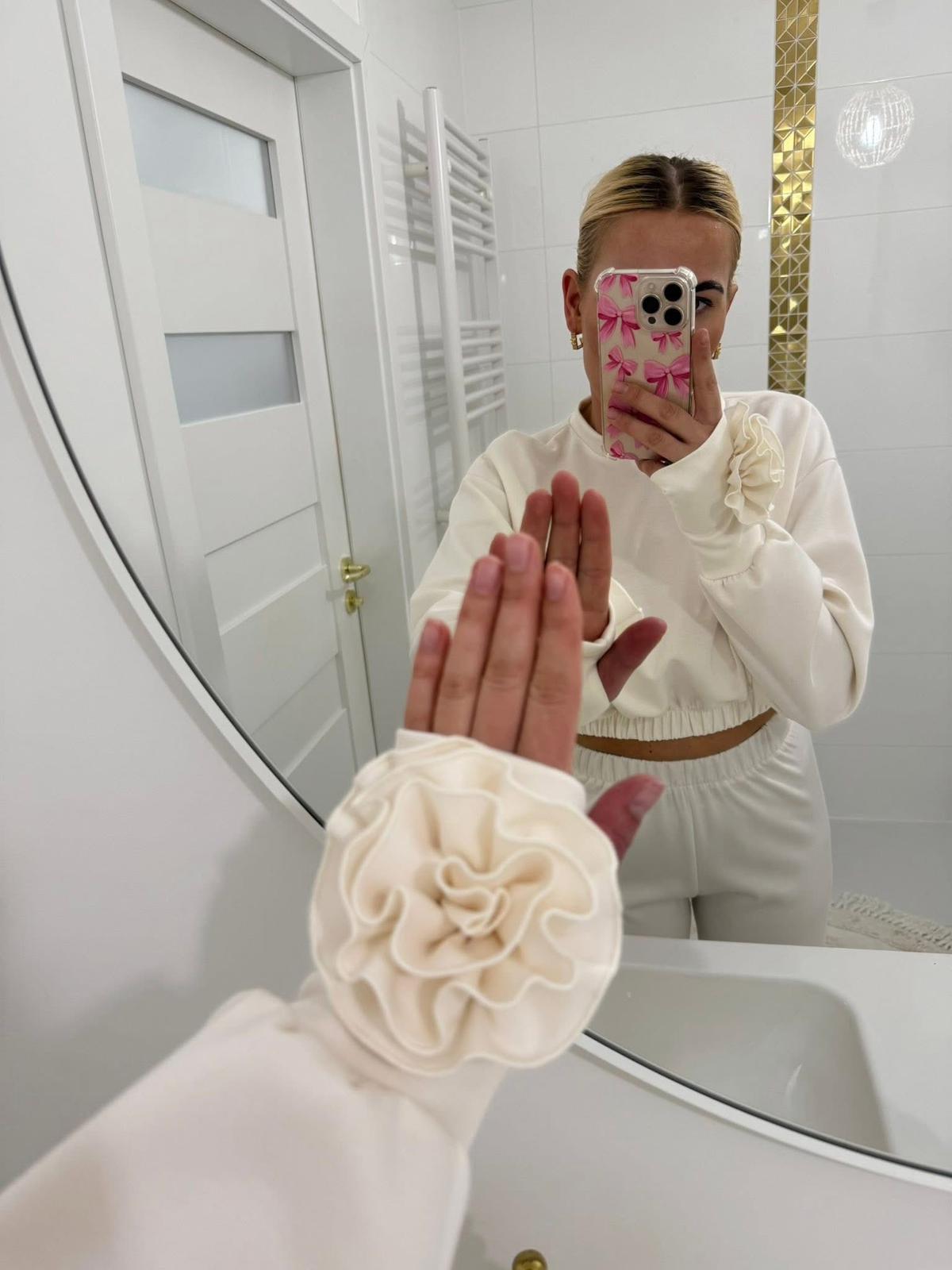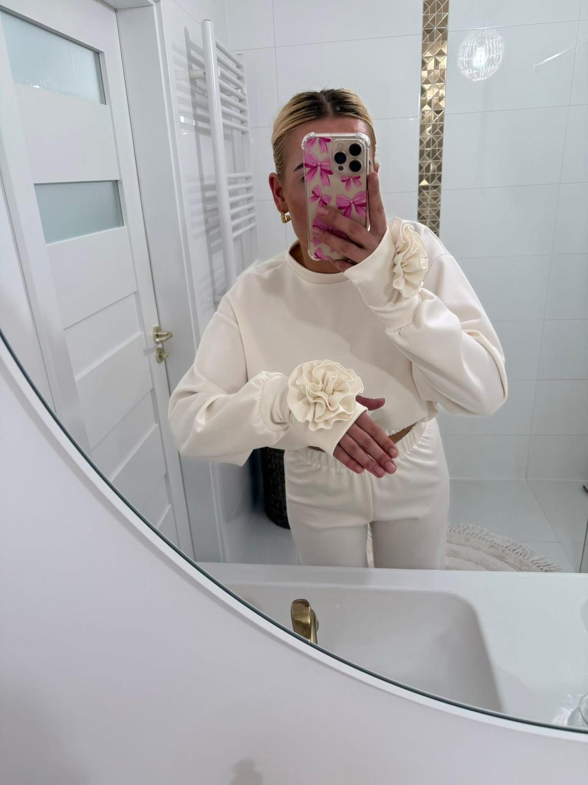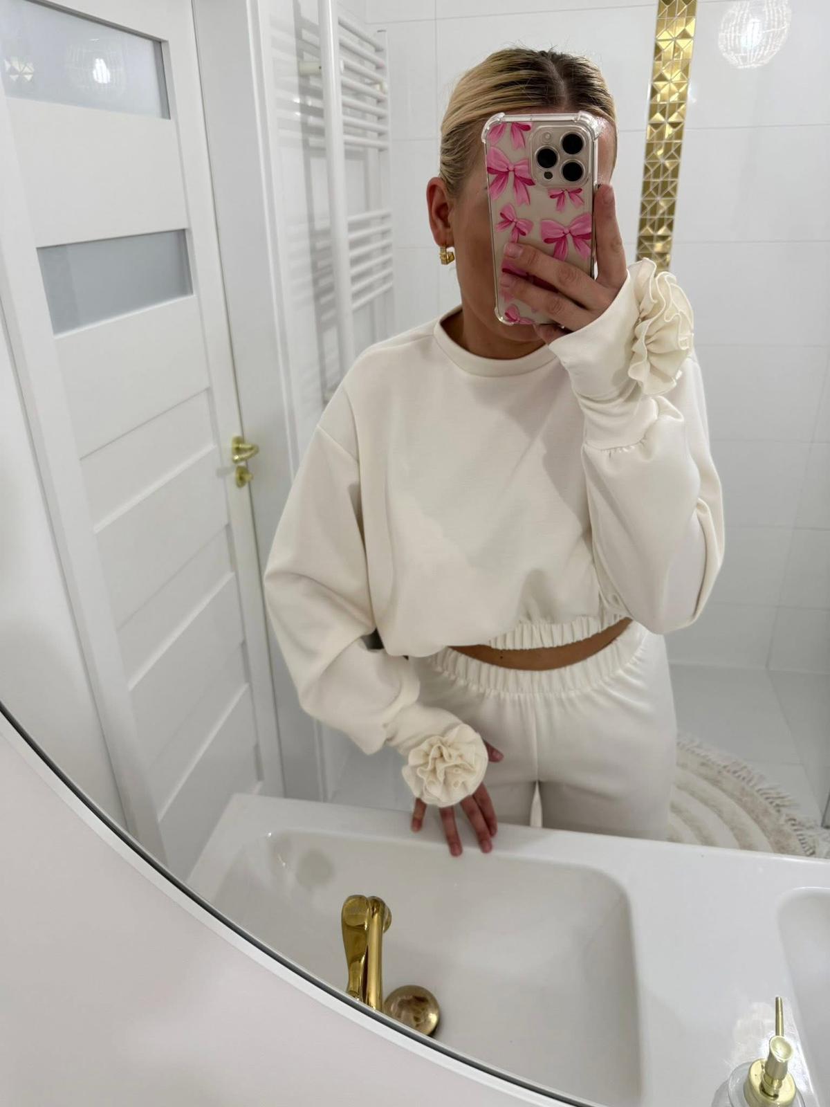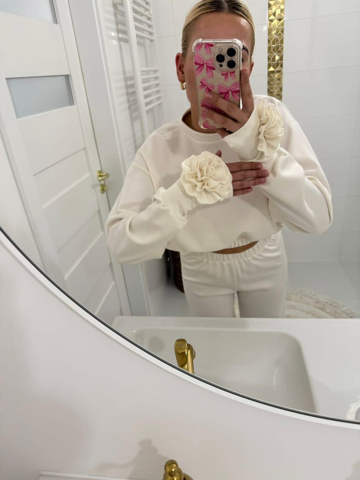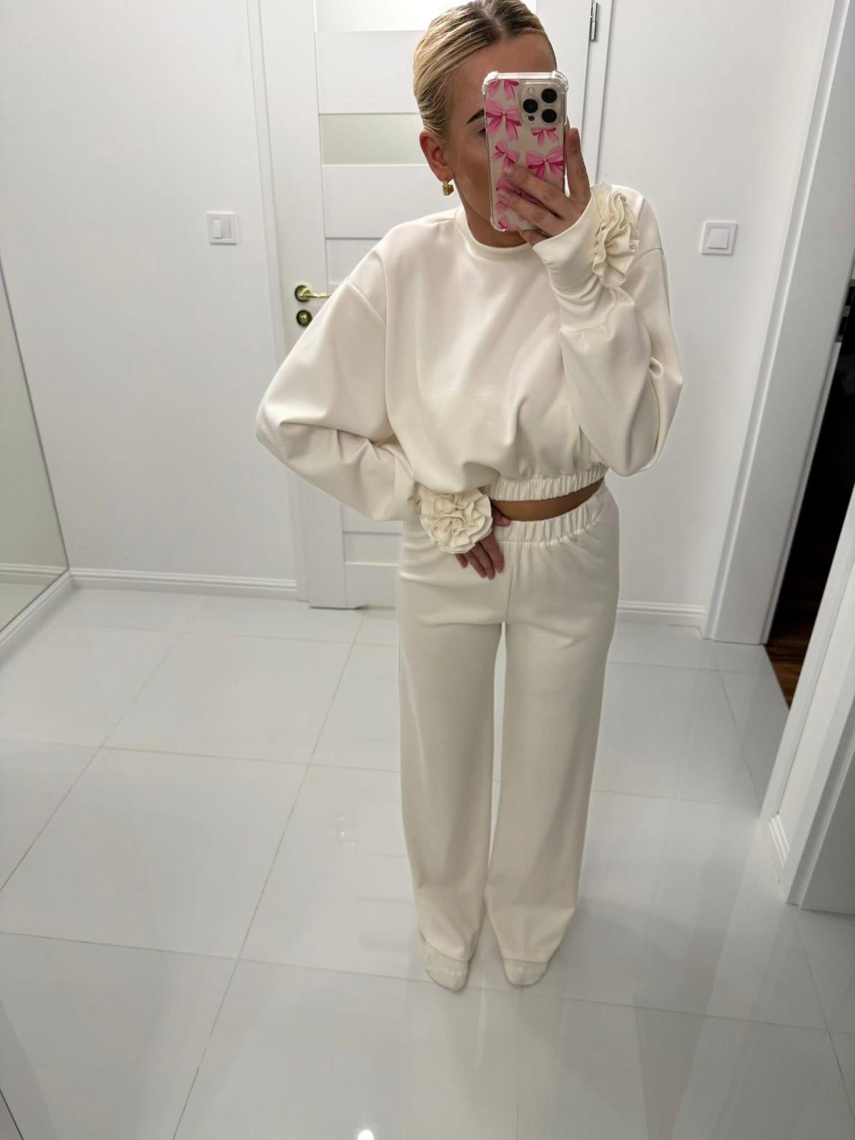 Stylowy i niezwykle kobiecy komplet dresowy w odcieniu delikatnej śmietanki to połączenie wygody i subtelnej elegancji. Minimalistyczna forma została przełamana efektowną aplikacją róży przy mankiecie oraz w pasie, która nadaje całości wyjątkowego charakteru.