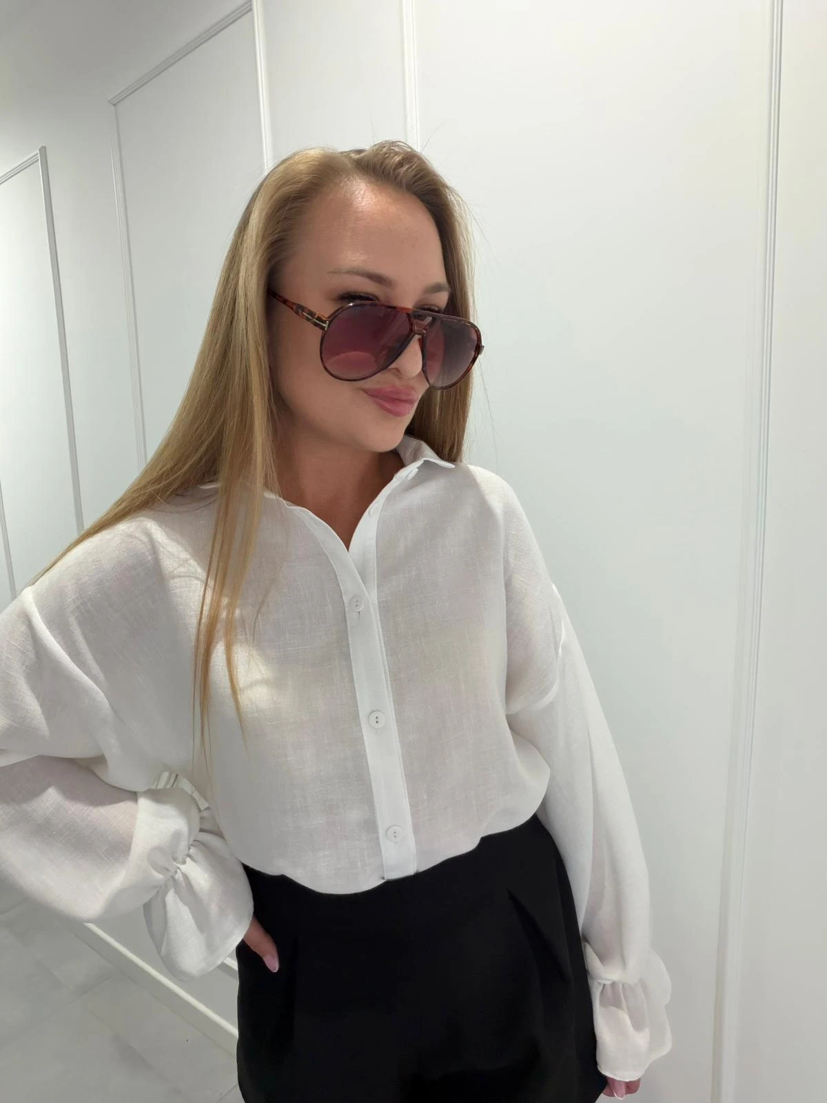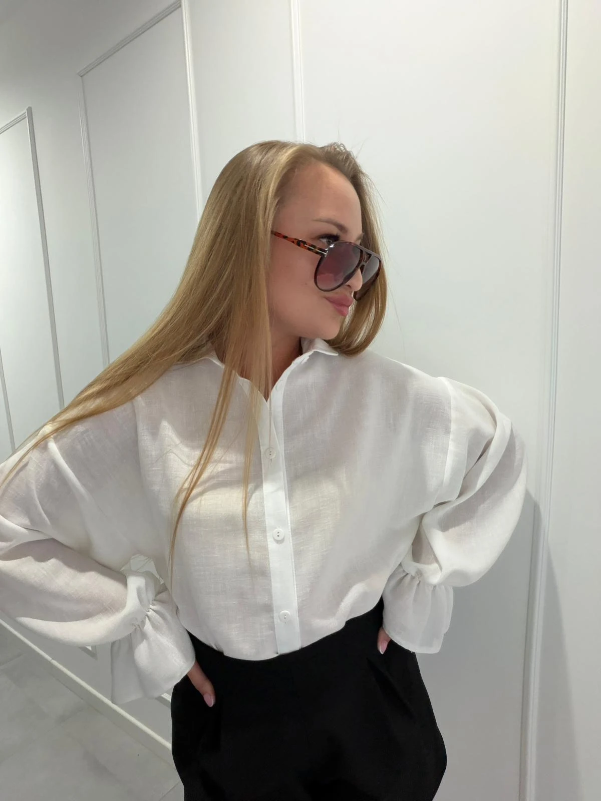 Model o luźniejszym kroju z subtelnie opuszczoną linią ramion i efektownymi, marszczonymi mankietami, które nadają całości kobiecego charakteru. Delikatnie transparentna tkanina pięknie układa się na sylwetce, tworząc stylowy i niewymuszony look.