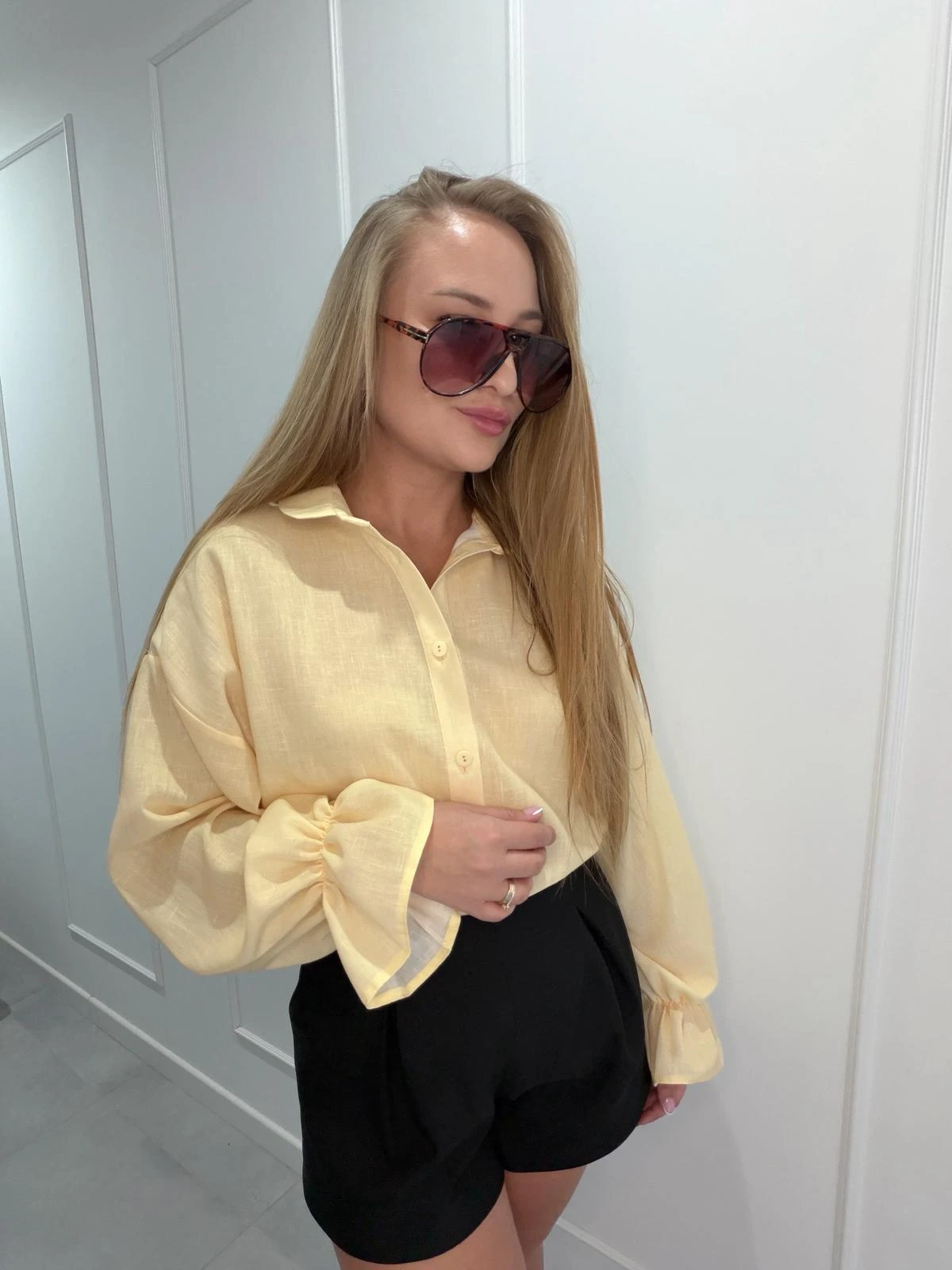 Model o luźniejszym kroju z subtelnie opuszczoną linią ramion i efektownymi, marszczonymi mankietami, które nadają całości kobiecego charakteru. Delikatnie transparentna tkanina pięknie układa się na sylwetce, tworząc stylowy i niewymuszony look.
