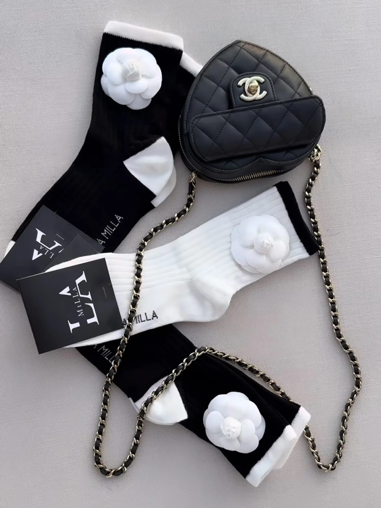 Prążkowane skarpetki z efektowną aplikacją 3D w formie białego kwiatu. Dostępne w czerni i bieli, z subtelnym logo LAMILLA. Stylowy dodatek, który podkręci każdą stylizację.