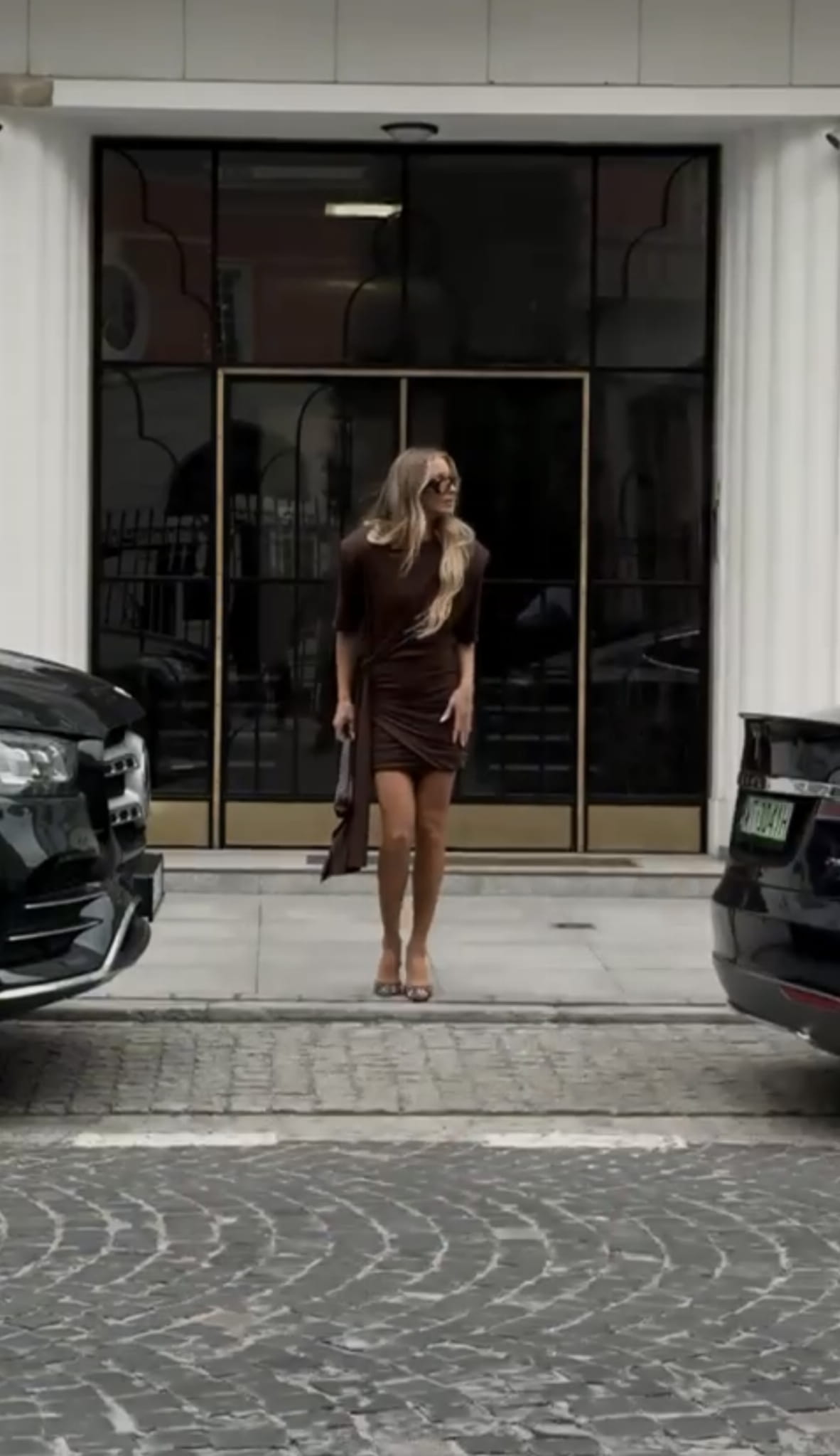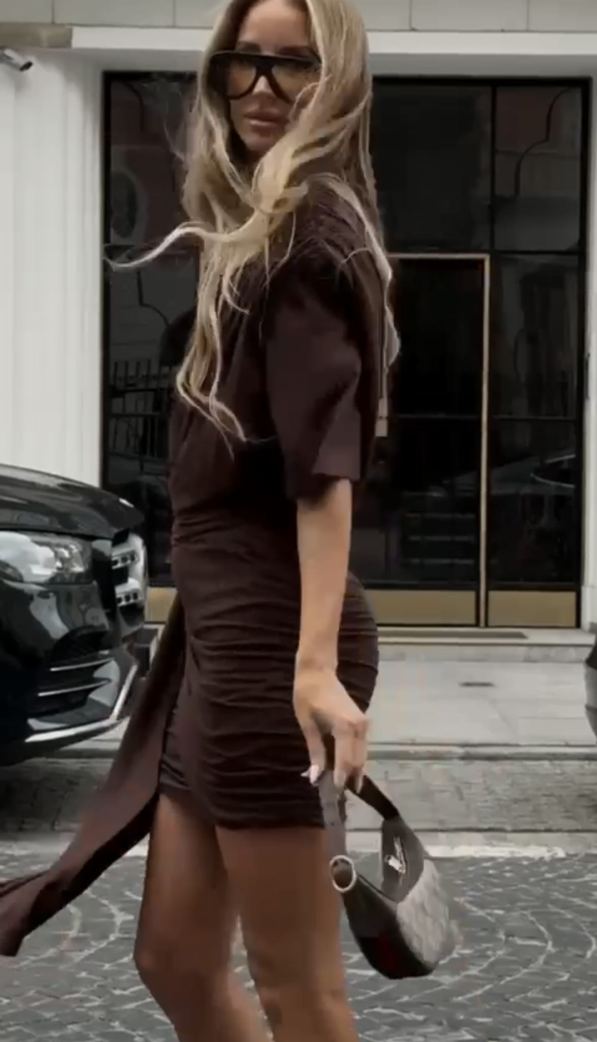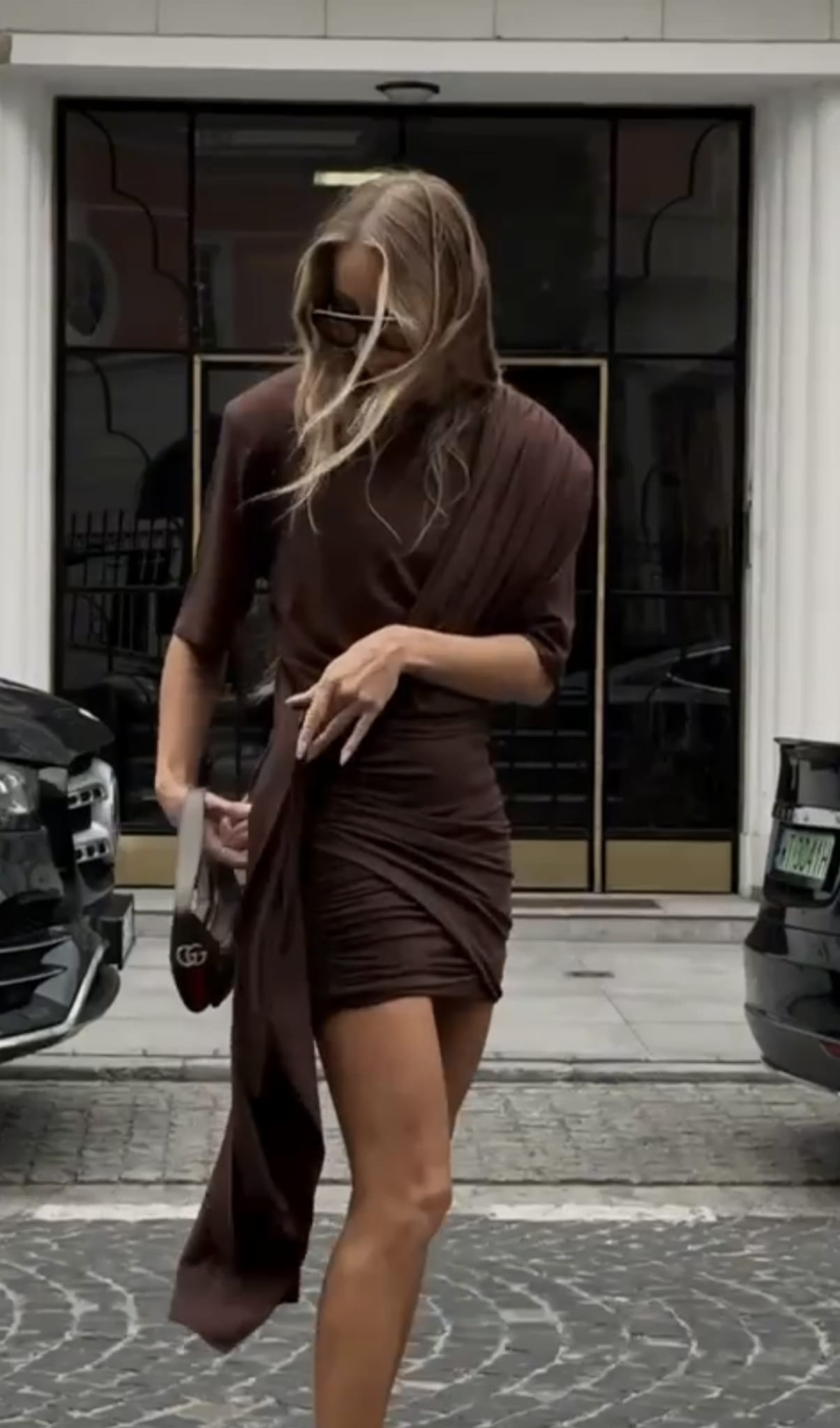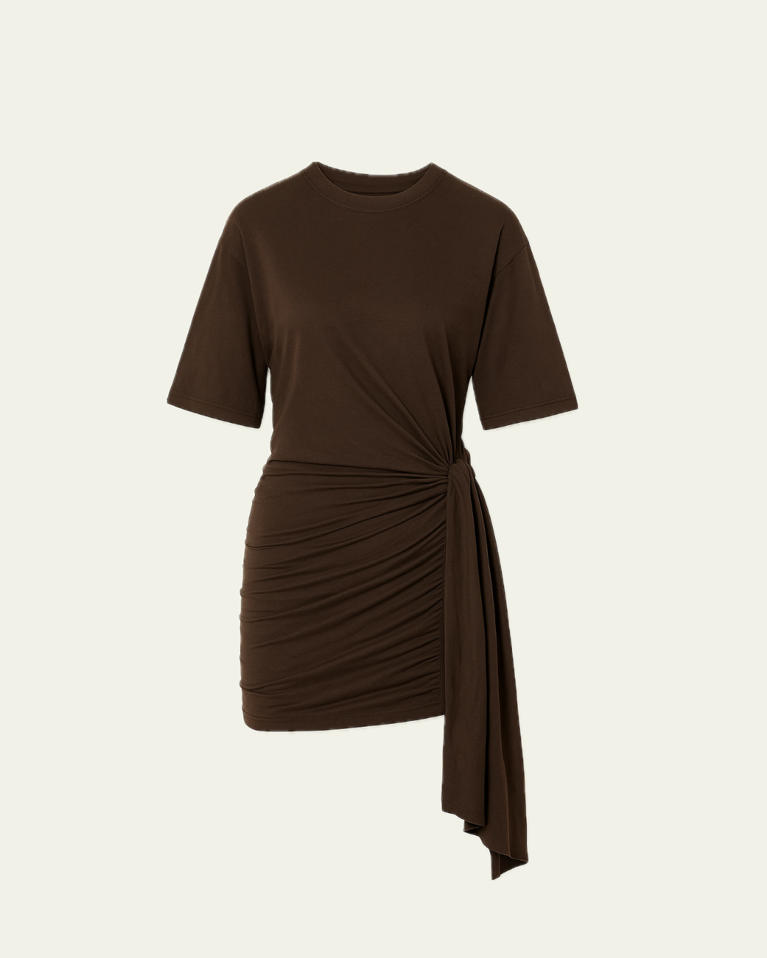 Dopasowany krój z efektownym drapowaniem w talii pięknie podkreśla sylwetkę, a asymetryczne wiązanie dodaje całości charakteru. Minimalistyczny fason z krótkim rękawem sprawia, że to model idealny zarówno na co dzień, jak i na wieczorne wyjście.