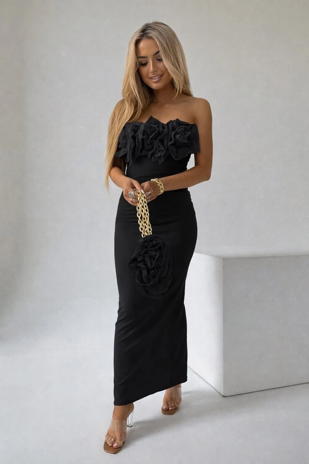 Elegancka sukienka maxi o dopasowanym kroju, która podkreśla sylwetkę i wydłuża proporcje. Górę zdobią efektowne, trójwymiarowe kwiaty nadające całości kobiecego i luksusowego charakteru.