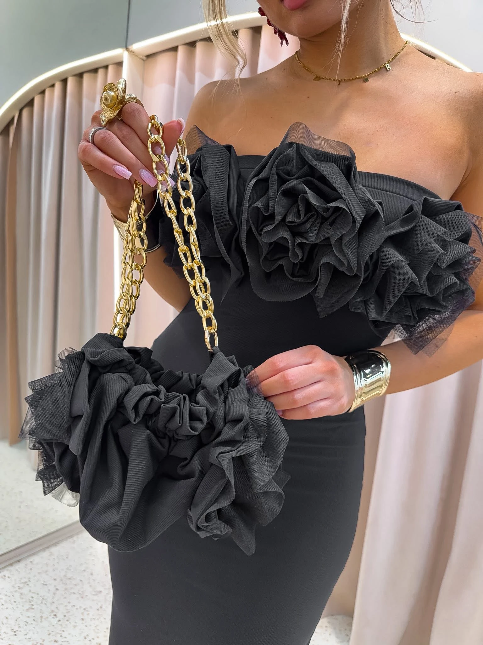 W zestawie znajduje się torebka z kwiatowym wykończeniem na złotym łańcuszku, tworząca spójną stylizację.