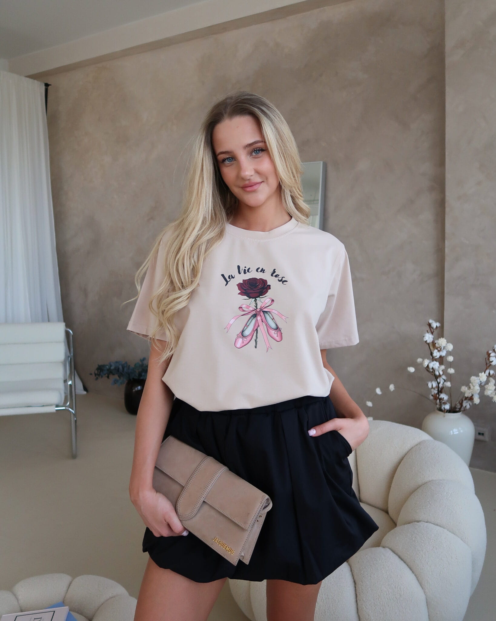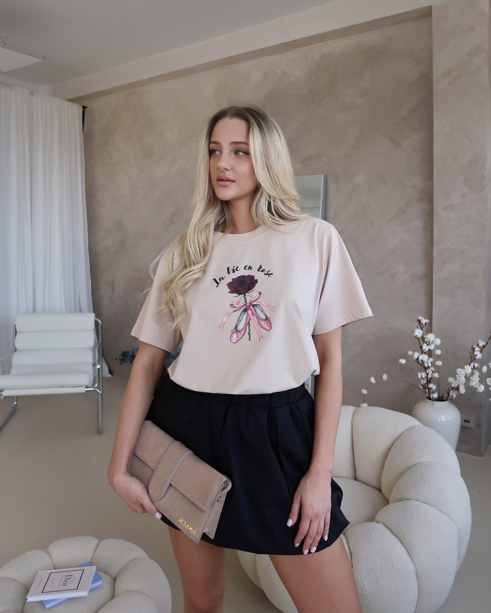 T-shirt Ballet to połączenie delikatności i wyrazistego stylu. Miękki materiał otula skórę, zapewniając wygodę przez cały dzień, a swobodny krój daje pełną dowolność stylizacji. Nadruk róży w kobiecym wydaniu przyciąga spojrzenia – jest subtelny, ale nie do przeoczenia.