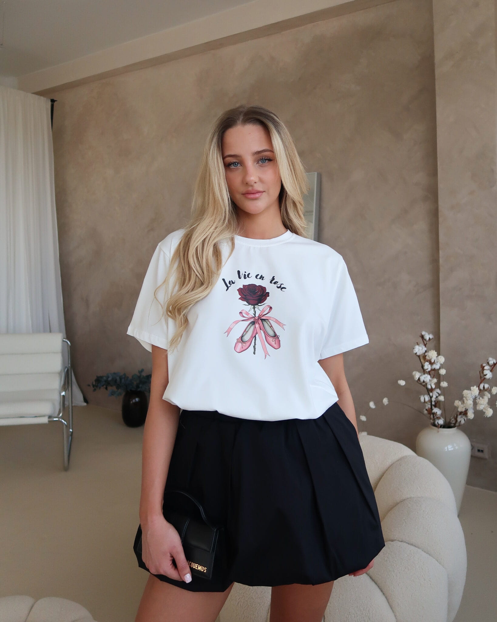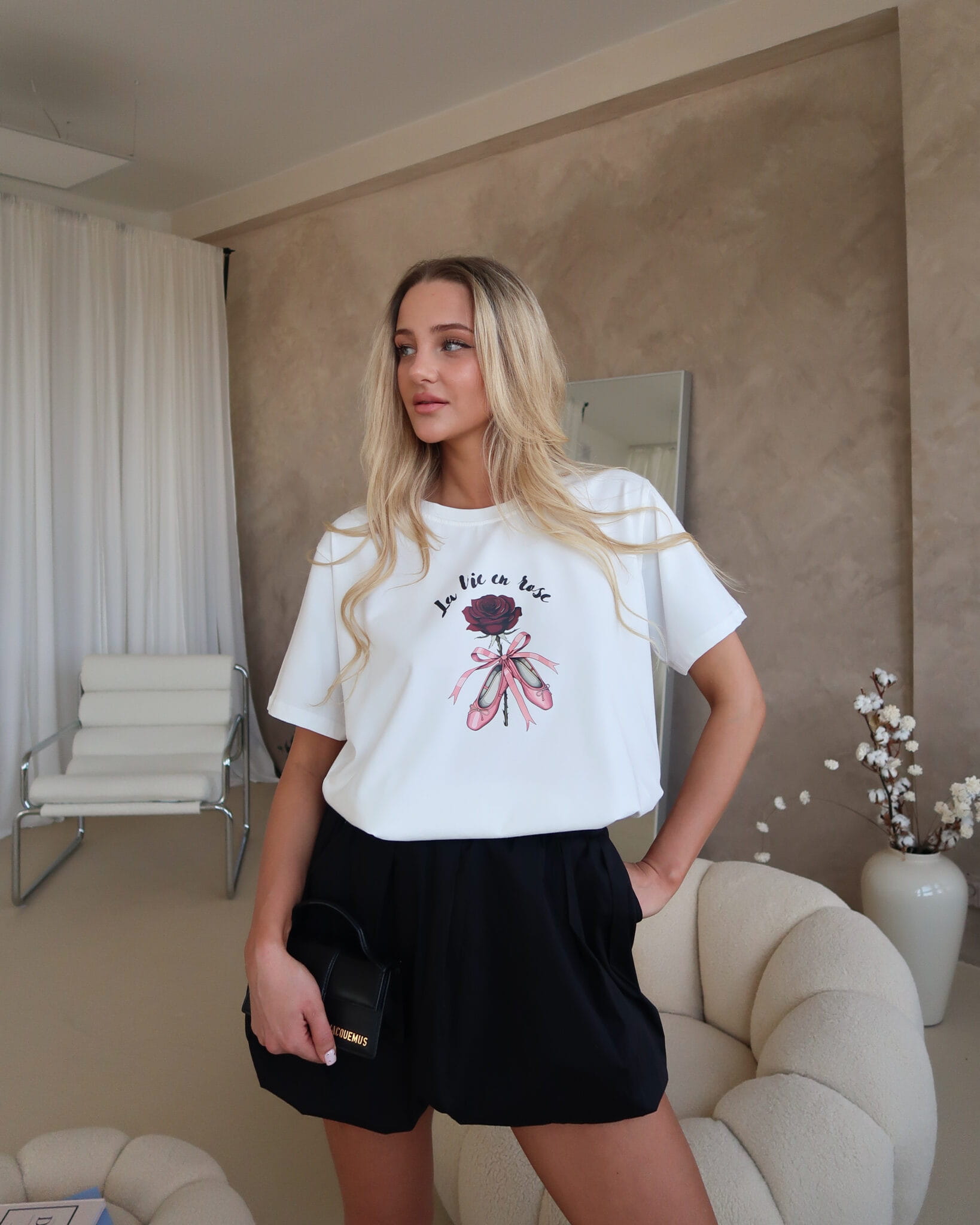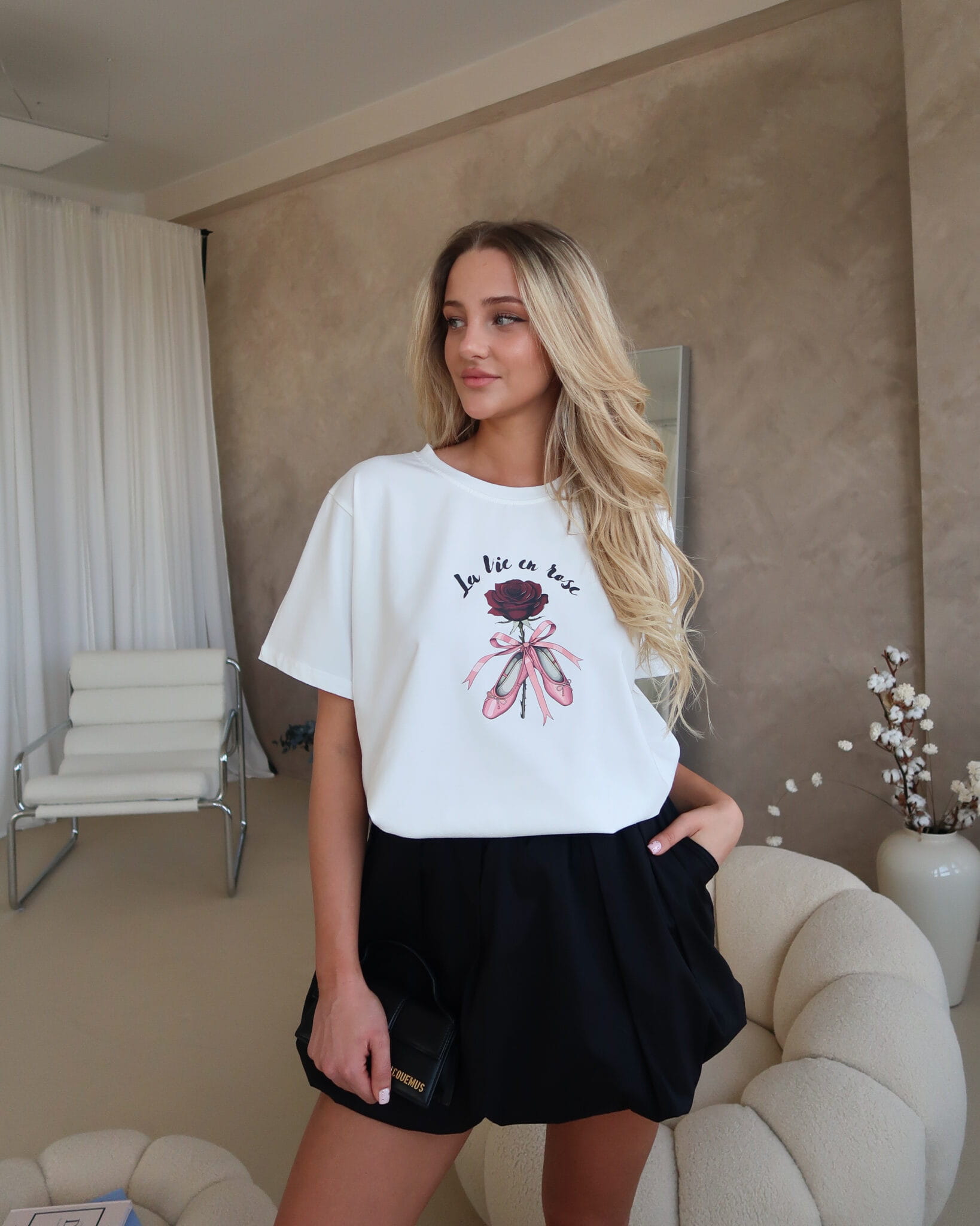 T-shirt Ballet to połączenie delikatności i wyrazistego stylu. Miękki materiał otula skórę, zapewniając wygodę przez cały dzień, a swobodny krój daje pełną dowolność stylizacji. Nadruk róży w kobiecym wydaniu przyciąga spojrzenia – jest subtelny, ale nie do przeoczenia.