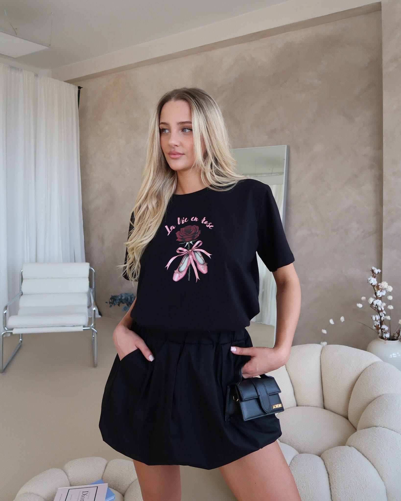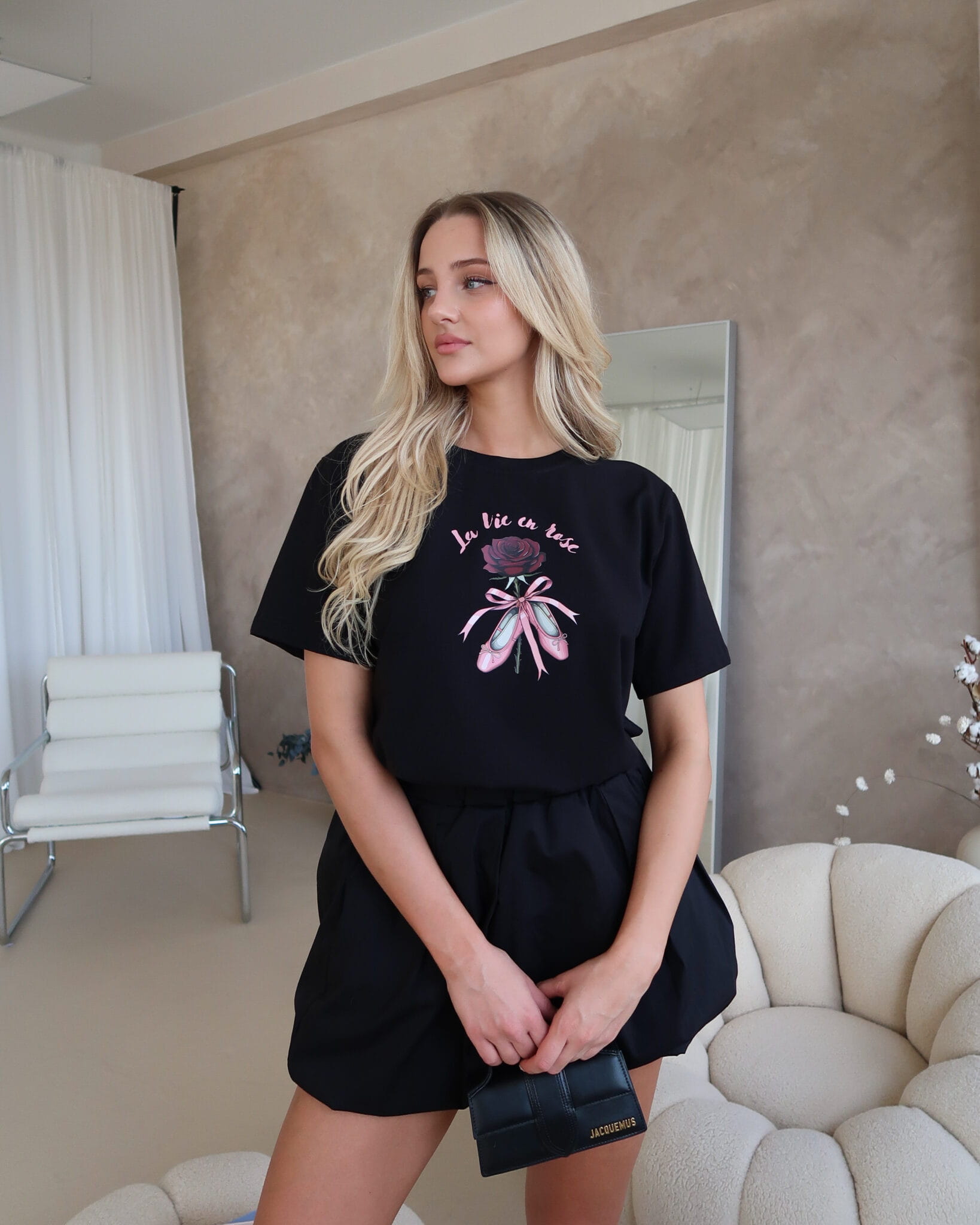 T-shirt Ballet to połączenie delikatności i wyrazistego stylu. Miękki materiał otula skórę, zapewniając wygodę przez cały dzień, a swobodny krój daje pełną dowolność stylizacji. Nadruk róży w kobiecym wydaniu przyciąga spojrzenia – jest subtelny, ale nie do przeoczenia.