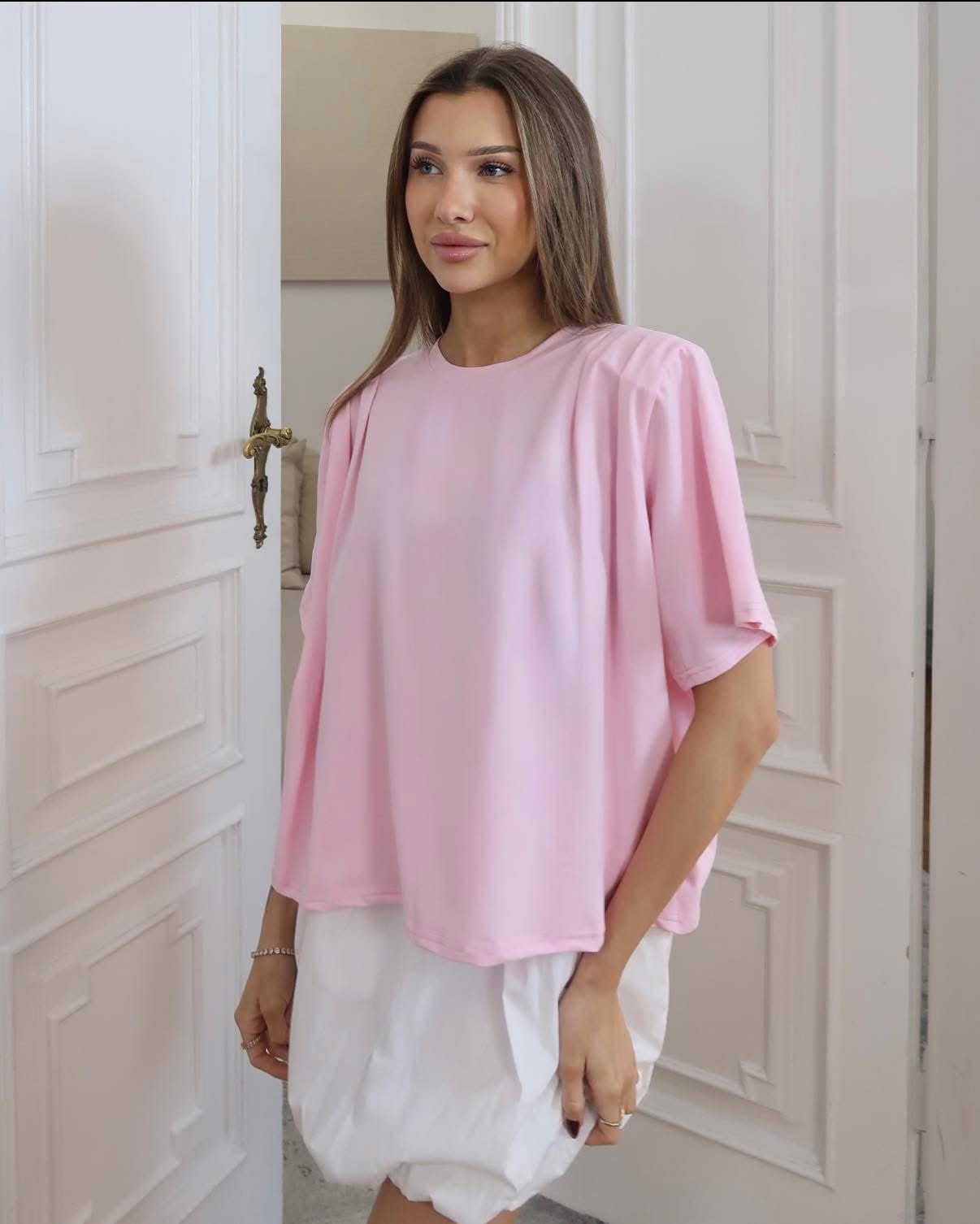 T-shirt damski Maya z poduszkami na ramionach i zakładkami pudrowy róż