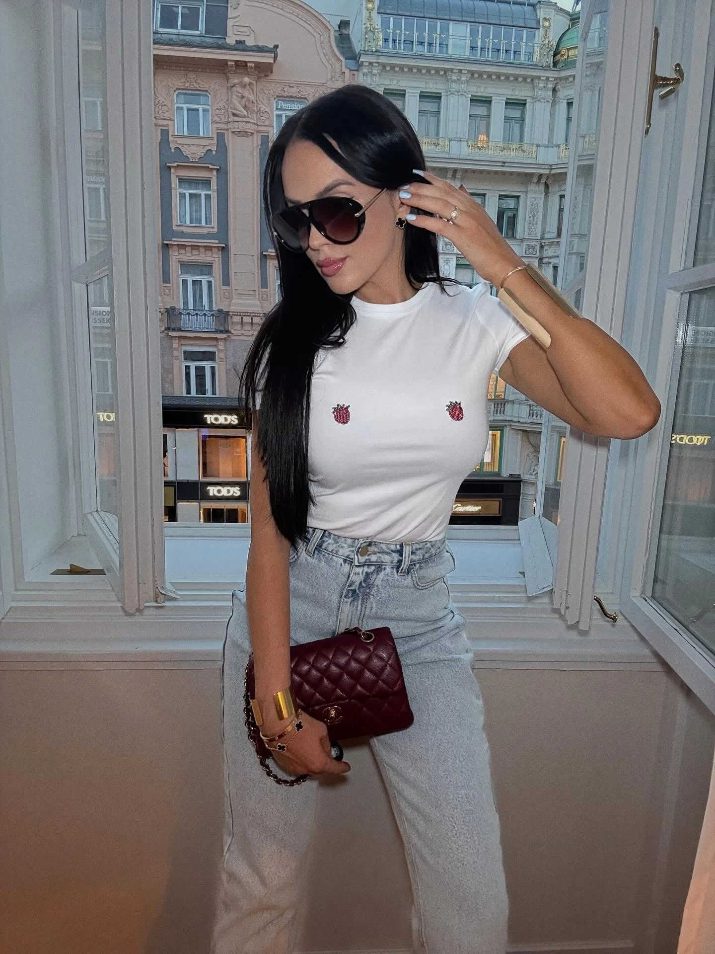 Klasyka z pazurem. Biały T-shirt z dwiema aplikacjami z czerwonych kryształków, które przyciągają wzrok subtelnym blaskiem. Minimalistyczny fason z odważnym akcentem – idealny dla kobiet, które lubią bawić się modą i wyróżniać w prosty, ale efektowny sposób.